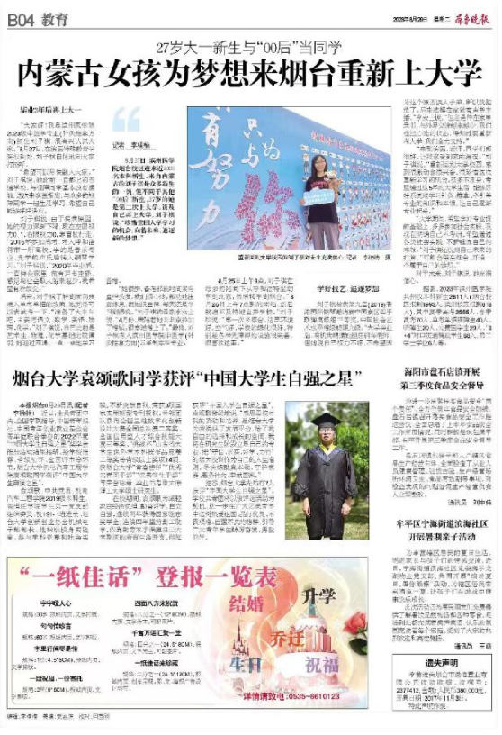 齐鲁晚报8月29日B04版刊发《强乱强乱中文字幕袁颂歌同学获评“中国大学生自强之星”》