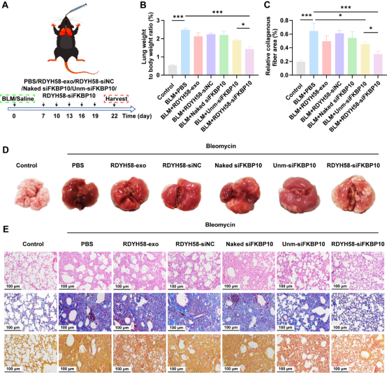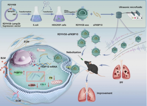 该研究工作首次成功构建了RDYH58修饰的外泌体(RDYH58-exo),并负载FK506结合蛋白的小干扰RNA(siFKBP10)。该递送系统能精准靶向肌成纤维细胞,通过下调肺部FKBP10表达,有效抑制胶原蛋白的生成与分泌,从而显著缓解小鼠IPF病理进程。该研究在开发新型靶向IPF治疗策略领域取得了重要的新突破。