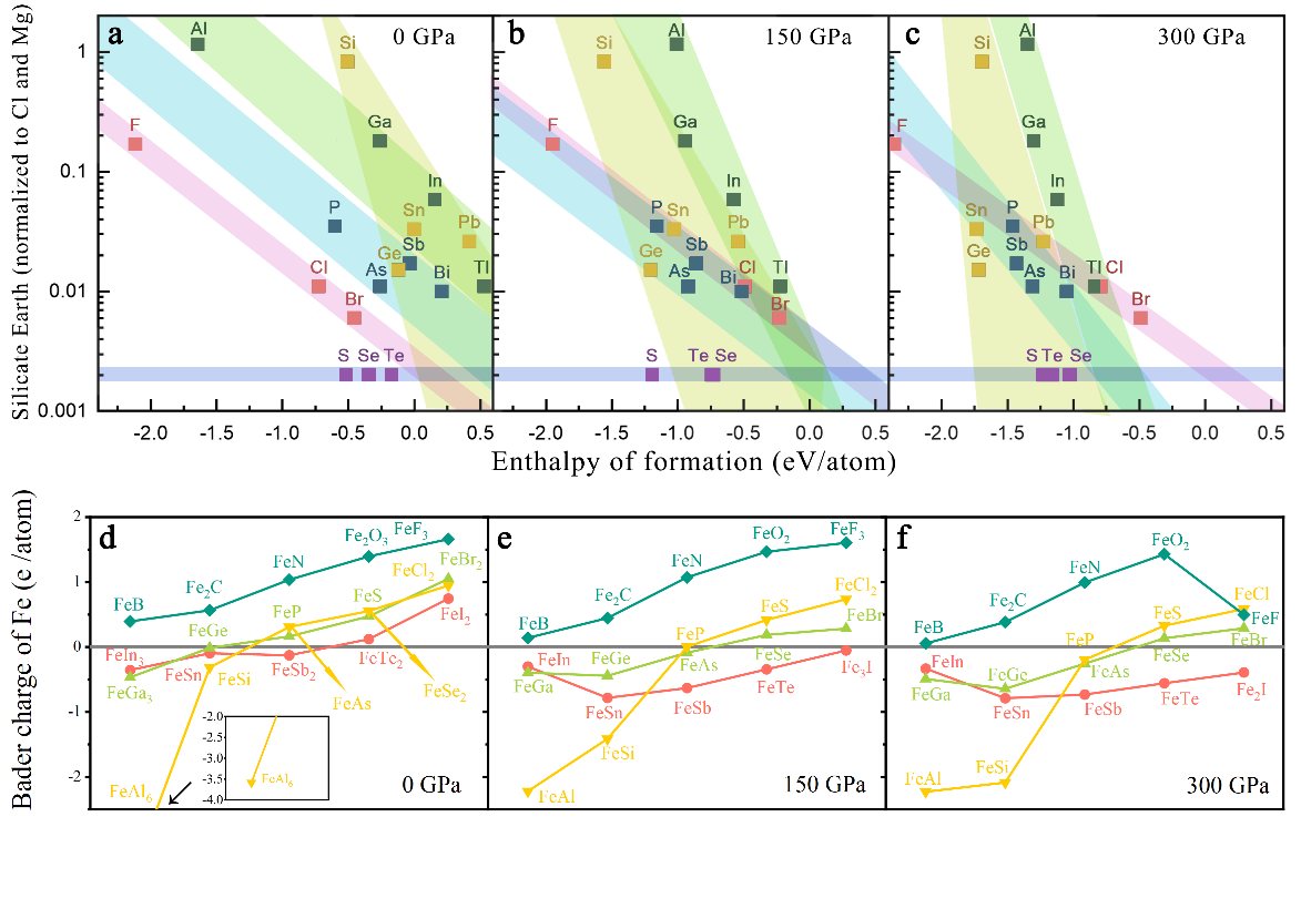 此外,一个显著的突破是发现了硅与铁结合的独特异常性。随着压力升高,铁-硅键的强度增幅远超其他元素组合,在250 GPa时甚至超过铁-氧键,使硅成为典型的亲铁元素。这一特性暗示硅可能是地球核心中关键的轻元素成分,不仅能解释地震学观测到的核心密度异常(低于纯铁镍合金),还为解决“地幔中镁/硅比值高于球粒陨石”的谜题提供了合理答案。