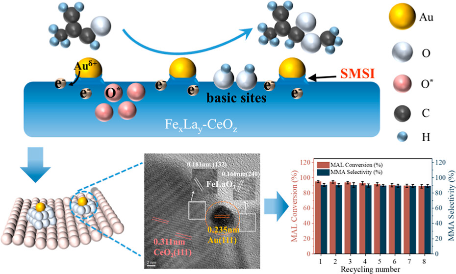 醇醛一步氧化酯化法在实际生产中具有重要意义。金催化剂可有效催化甲基丙烯醛(MAL)与甲醇(MeOH)直接反应生成甲基丙烯酸甲酯(MMA),但其复杂的制备工艺和较高的醇醛比限制了其工业应用。课题组商用CeO2为载体,采用改进的沉积沉淀法合成了FexLay-CeOz复合氧化物(FLC)负载型纳米金催化剂Au/FLC,通过匹配合适的碱性位点获得较强的SMSI,促进了金与载体间电子转移并产生更多的活性氧物种,显著提高了催化剂的催化性能(见图1)。在无碱环境、Au/MAL=0.05 mol%条件下,该催化剂实现97.5%的MAL转化率、95.3%的MMA选择性及487.5 h-1的周转频率(TOF),创同类型催化剂性能新高。机理研究表明,SMSI效应不仅提升Au纳米颗粒的锚定稳定性(赋予催化剂优异的循环使用性能),更通过协同活性氧物种与碱性位点,在低醇醛比条件下实现高效气-液-固三相催化。该研究获山东省自然科学基金、甘肃省自然科学基金、国家自然科学基金及烟台市科技创新发展计划联合资助。研究成果为金基催化剂在精细化学品绿色合成领域的规模化应用提供了重要理论支撑与技术范式。