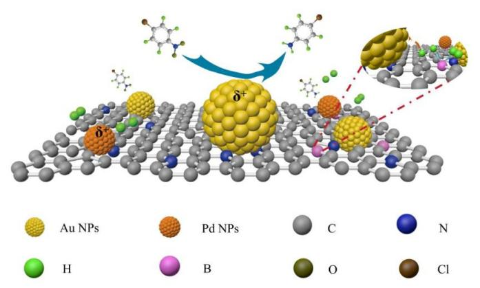 近日,强乱强乱中文字幕化学化工学院山东省黄金工程技术研究中心/烟台市黄金催化与过程重点实验室祁彩霞教授和孙立波副教授研究团队利用导电聚合物聚苯胺(PANI)的掺杂-去掺杂策略经热解获得不同杂原子掺杂的碳基载体,并通过胶体吸附技术在其上负载含有微量Pd的Pd-Au双金属,系统研究了杂原子掺杂对活性金属电子结构及催化性能的影响。结果表明,引入痕量钯显著提高了金基催化剂的转化率,同时保持了良好的选择性。B掺杂显著改变了载体的表面化学性质,并引入了协同的路易斯酸碱位点,提升了H2解离效率。通过金属-载体相互作用,B掺杂精确调控了活性位点的电子状态,优化了反应物的吸附行为,上述成果以“Polyaniline-derived B/N-doped carbon supporting isolated Pd and Au nanoparticles as a bimetal catalyst for high-performance 4-chloronitrobenzene hydrogenation”为题发表在Applied catalysis A 2026, 711, 120740杂志上。此外,课题组还发现磷掺杂碳负载的Pd-Au双金属催化剂可以调变金属的微化学环境,在金属表面诱导产生缺电子态,促进了-NO2吸附和产物脱附,从而提高了催化效率。相关成果以“Preparation and catalytic performance study of Pd-Au bimetallic catalysts supported on polyaniline-derived nitrogen and phosphorus co-doped carbon for the selective hydrogenation of p-chloronitrobenzene”为题,作为前期工作同样发表在Applied Catalysis A 2025, 702, 120332杂志上。上述研究为通过载体掺杂工程调控金属催化剂微环境提供了理论指导和技术参考,为开发高效高选择性工业加氢催化剂提供了关键数据支撑。